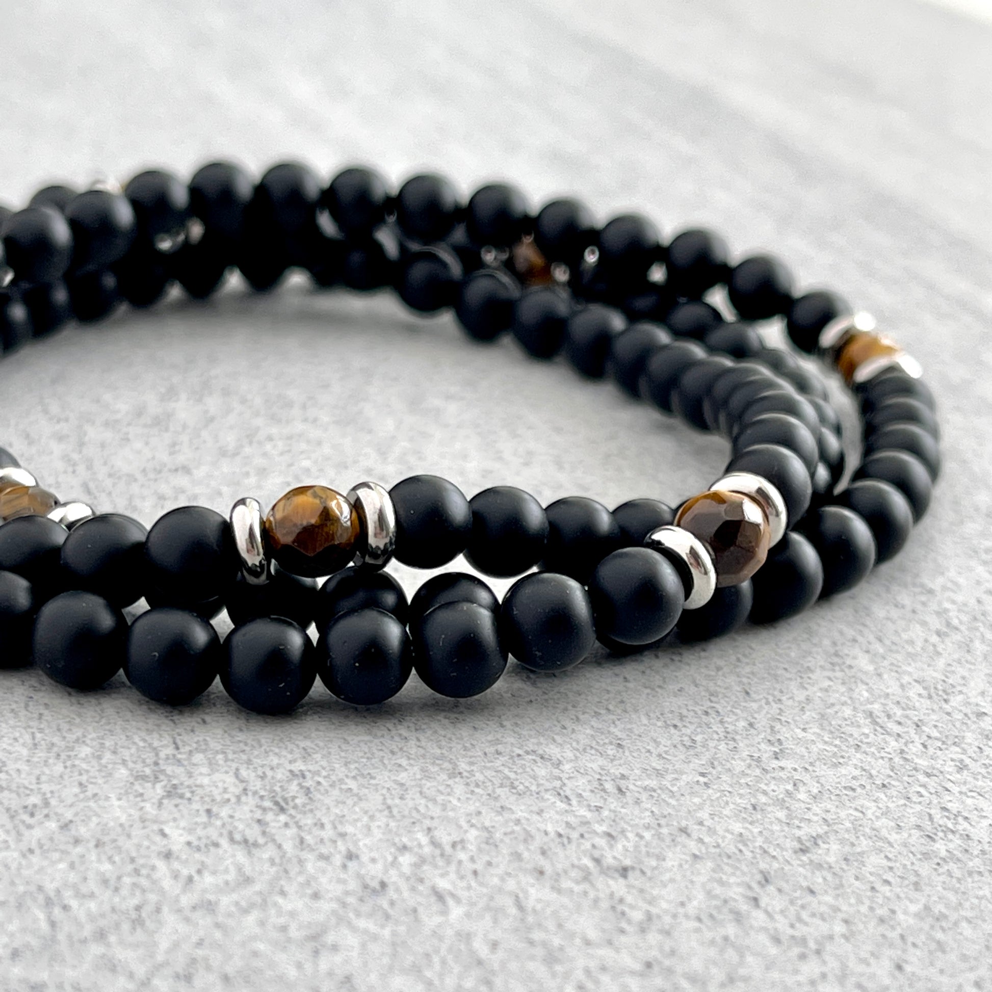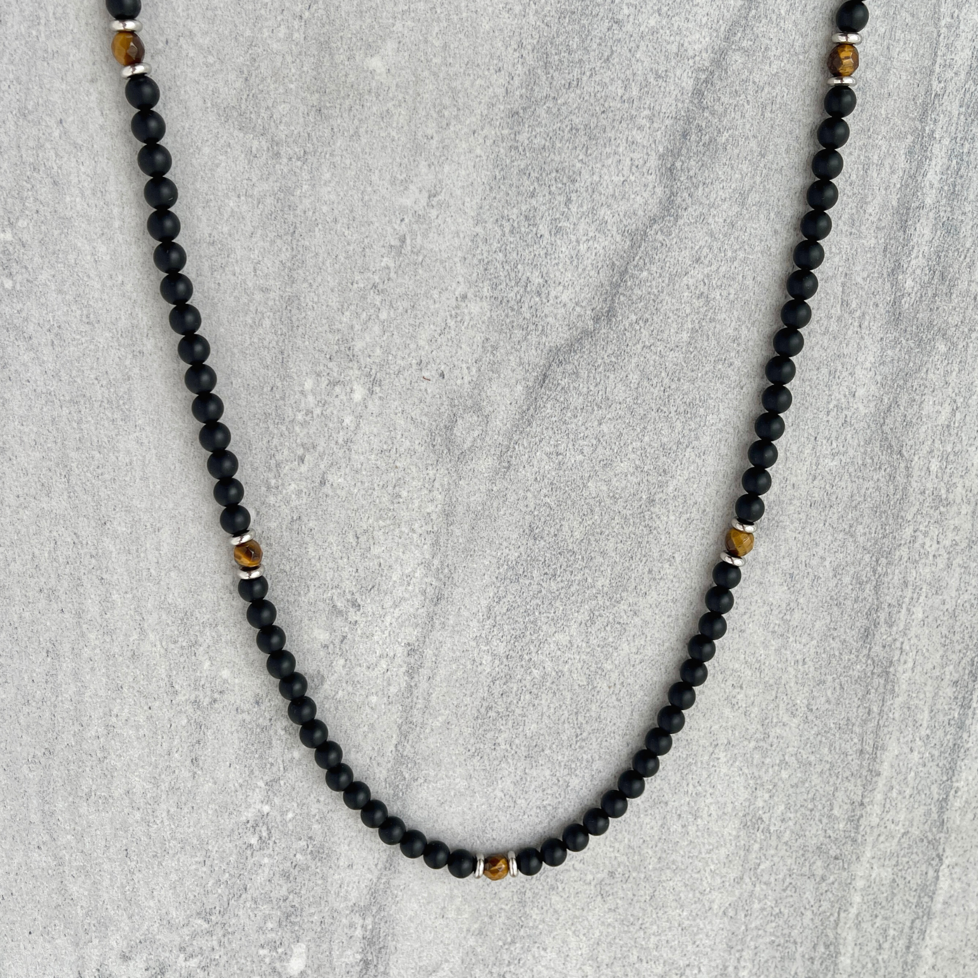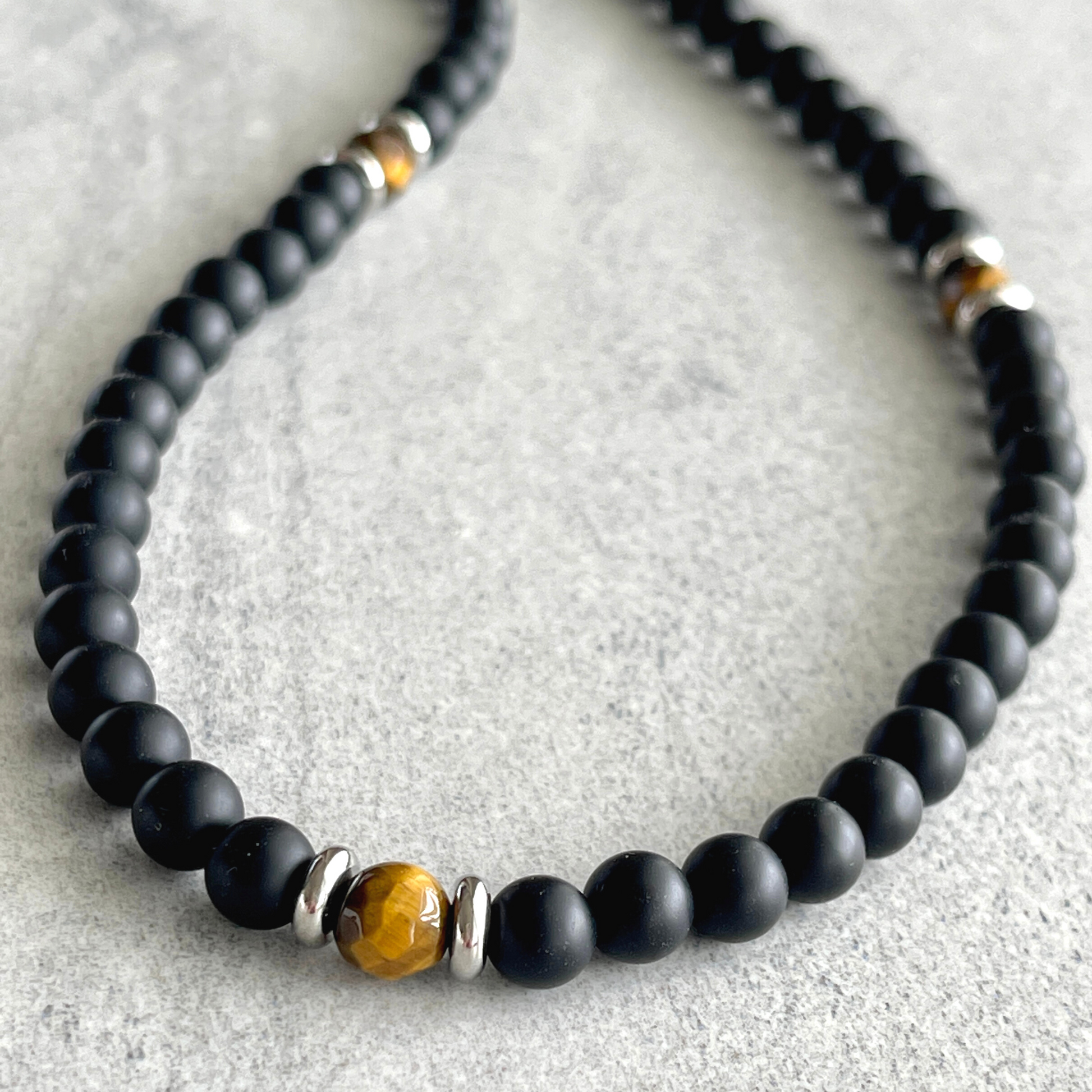 Matte Onyx Beaded Necklace with Faceted Yellow Tiger Eye
